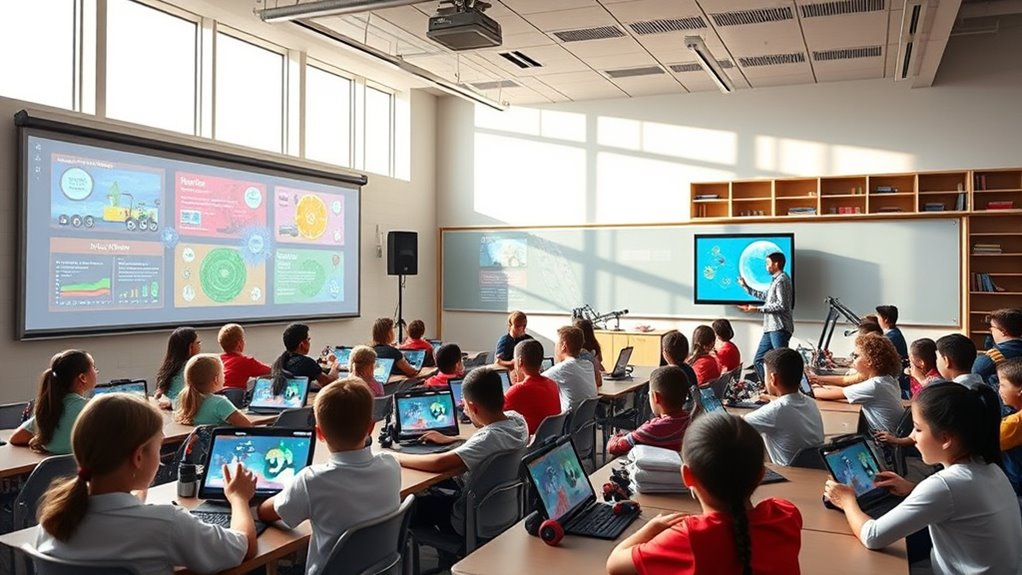 If you’re looking for the 15 best smart classroom kits that make learning more engaging, I’ve got you covered. These include hands-on science kits like the Geyser Tube and Life Cycle Spinners, STEM and robotics sets for building and coding, indoor gardening systems, and creative tools like Makey Makey and wireless HDMI displays. Each one is designed to create memorable, interactive lessons. Keep exploring to find out which kits best suit your teaching needs and inspire curiosity in your students.