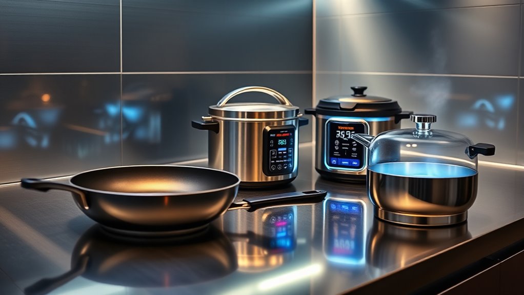 If you’re looking to revolutionize your kitchen by 2025, the top smart cookware options combine advanced materials like ceramic, titanium, and reinforced aluminum with innovative features like Wi-Fi connectivity, voice control, and smart sensors. These sets offer precise temperature control, quick heating, and multi-purpose versatility, making cooking safer and easier. Many are also designed for easy cleaning and energy efficiency. Keep exploring, and you’ll discover even more ways these smart tools can transform your culinary experience.