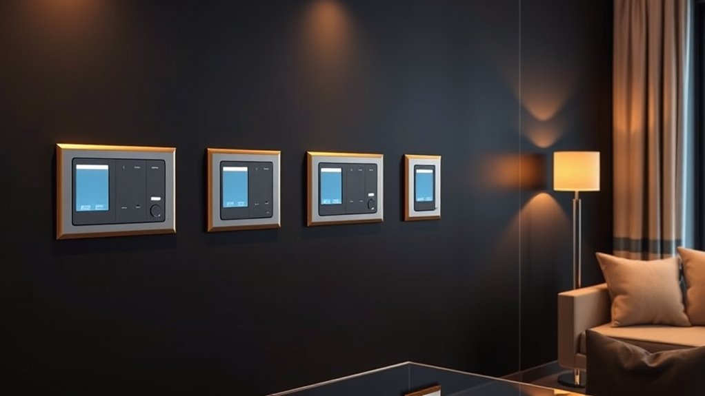 Choosing a dimmer switch that fits your home’s decor is essential for creating a cohesive and stylish environment. I recommend selecting a switch that complements your existing color scheme, finish, and style to guarantee it blends seamlessly. Consider the control method you prefer, whether paddle, toggle, or touch-sensitive, to enhance usability and match your aesthetic. Pay attention to the size and form factor so it fits comfortably within your wall plate and electrical box without protruding or looking out of place. Aesthetic features like LED indicators, backlit panels, or modern finishes can add visual appeal and functionality. Most importantly, guarantee the design aligns with your overall smart home ecosystem, making your space look unified and thoughtfully curated.