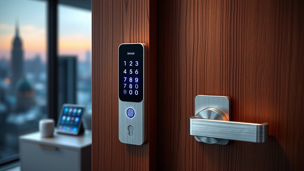 Smart locks are designed with tamper-resistant features like sturdy materials, reinforced strike plates, and alarm systems that activate if someone tries forced entry. I’ve found that many models also include anti-tampering alarms and auto-locking mechanisms, making it harder for intruders to succeed. While no lock is completely invulnerable, these security measures markedly improve resistance to physical tampering, giving me peace of mind knowing my home is better protected.