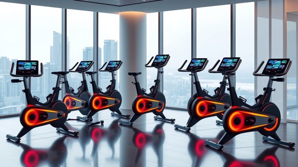 Looking to upgrade your home workouts in 2025? The top smart exercise bikes combine advanced features like large HD touchscreens, seamless app connectivity with platforms like Peloton, Zwift, and Apple Health, and customizable resistance levels for all fitness levels. They also offer space-saving designs, quiet operation, and sturdy build quality supporting up to 350 lbs. If you want insights on the best models and what to weigh, keep exploring to find the perfect fit for your goals.