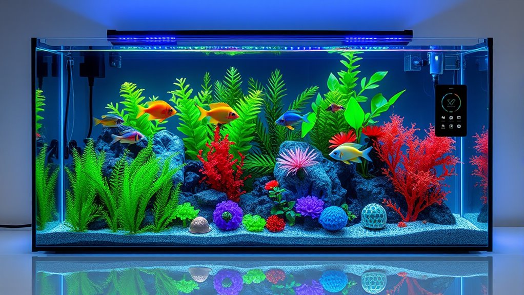 If you’re looking for smart fish tanks that make caring for your aquatic friends effortless and fun, I’ve found some fantastic options. Modern tanks feature automatic feeders, app-controlled lighting, self-cleaning systems, and water level management, all designed for easy maintenance and great visuals. These tanks suit beginners and hobbyists alike, offering convenience and peace of mind. Keep exploring, and you’ll discover all the smart features that can transform your aquarium experience.