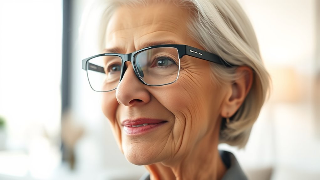 Choosing smart glasses for seniors requires careful attention to visual clarity and focus, ensuring the device meets individual eyesight needs. I look for models with auto-focus capabilities that automatically adjust for clear vision at various distances, eliminating the need for manual adjustments. Blue light protection is essential too, as it reduces eye strain and makes prolonged use more comfortable. High-resolution displays or lenses that boost contrast and sharpness considerably enhance clarity, helping me see details more clearly. Adjustable focus settings or customizable lenses are also important, allowing me to tailor the glasses to my specific visual requirements. Additionally, anti-reflective coatings minimize glare in different lighting conditions, ensuring my focus remains sharp and comfortable, whether indoors or outdoors.