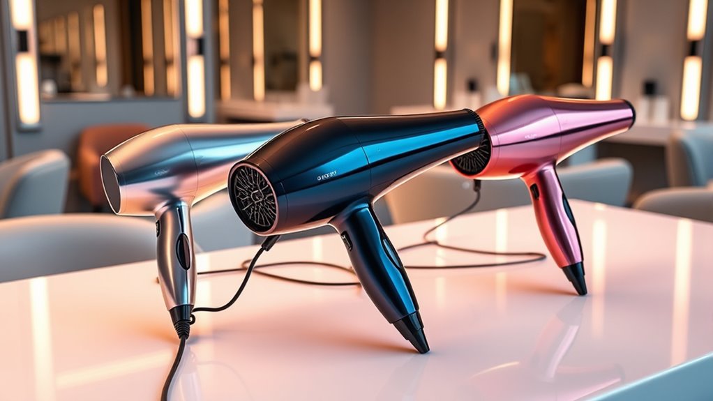 Ensuring precise temperature control is essential for preventing heat damage and achieving ideal styling results. Modern smart hair dryers use advanced sensors that monitor airflow temperature over 25 times per second, ensuring consistent heat levels. This real-time feedback helps prevent overheating, protecting your hair’s health. Multiple adjustable heat settings allow you to customize the drying process based on your hair type and styling needs, giving you greater control. LED display indicators provide immediate temperature feedback, so you know exactly how hot the airflow is at any moment. Additionally, innovative thermo-control systems automatically adjust the heat output, maintaining *best* drying conditions without you having to think about it. This combination of features makes temperature control both precise and user-friendly, leading to safer, more effective styling.