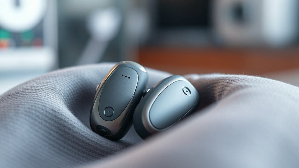 Choosing a smart hearing aid with an intuitive user interface can make a significant difference in your daily experience. A device with large, clear controls reduces the learning curve, especially for seniors or those with limited dexterity. Touchscreen controls should be straightforward, allowing quick adjustments to volume, modes, or settings without confusion. Visual indicators like LEDs or digital displays help you easily monitor battery life, mode status, or connection. Simplified operation, such as one-touch on/off and minimal button presses, makes everyday adjustments hassle-free. Compatibility with smartphone apps that feature straightforward menus and customizable presets further enhances usability. Overall, a user-friendly interface guarantees that you can effortlessly control your hearing aid, allowing you to focus on what truly matters—your conversations and environment.