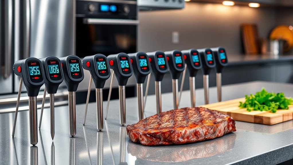 Choosing the right smart meat thermometer can feel overwhelming—like finding a needle in a haystack. But with options ranging from simple Bluetooth devices to WiFi-enabled probes, you’re sure to find one that fits your cooking style. Think of it as pairing a reliable friend with your culinary adventures—trustworthy yet innovative. Whether you’re a rookie or a pro, these thermometers make perfect meals effortless, turning everyday cooking into a deliciously smart experience.