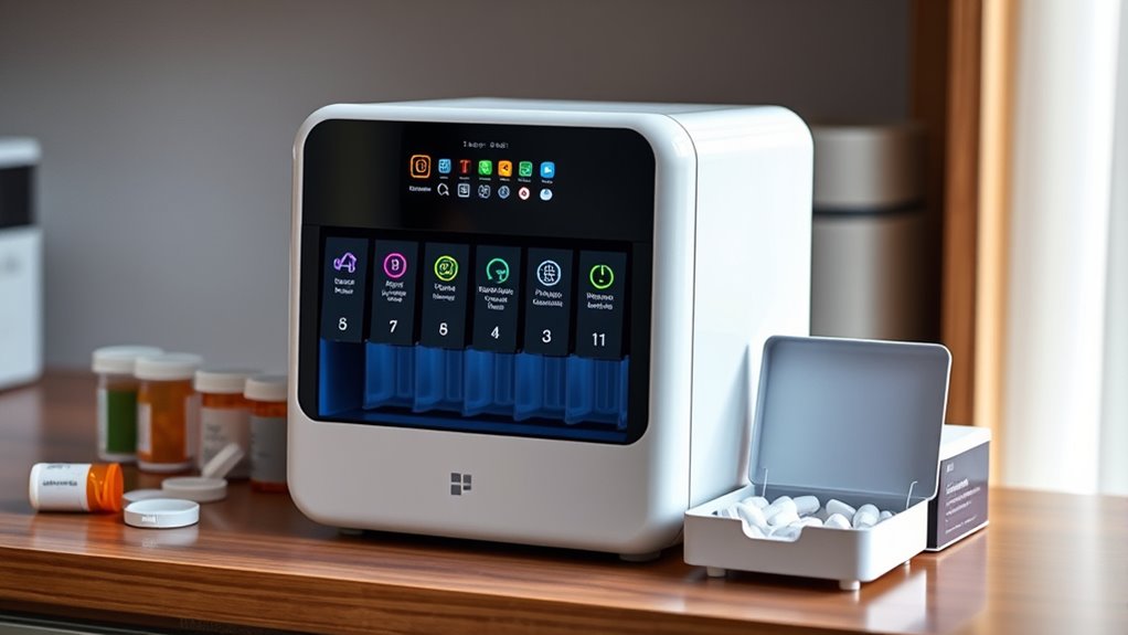 Selecting the right alert and reminder options is crucial to guarantee medication is taken on time. Different devices offer a variety of alerts, including alarms, flashing lights, push notifications, and voice reminders. Visual cues like blinking lights are perfect for users with hearing impairments or those who prefer subtle prompts. Audio alerts, such as beeping sounds or spoken messages, can be personalized with calming tones or familiar voices, making the reminders more effective and pleasant. Some dispensers combine multiple alert methods, like alarms paired with app notifications, to increase adherence. The key is choosing a dispenser with versatile options that match your preferences and needs. This ensures you stay on schedule and never miss a dose, supporting better health management.