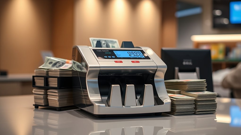Yes, these counters can handle mixed or slightly damaged bills effectively. I’ve found that most modern smart money counters are equipped with advanced sensors and image recognition technology, allowing them to detect counterfeit, torn, or crumpled bills quickly. However, extremely damaged bills might sometimes cause errors or jams. Regular maintenance and calibration help guarantee consistent performance, even with challenging cash, making the process smoother and more accurate.