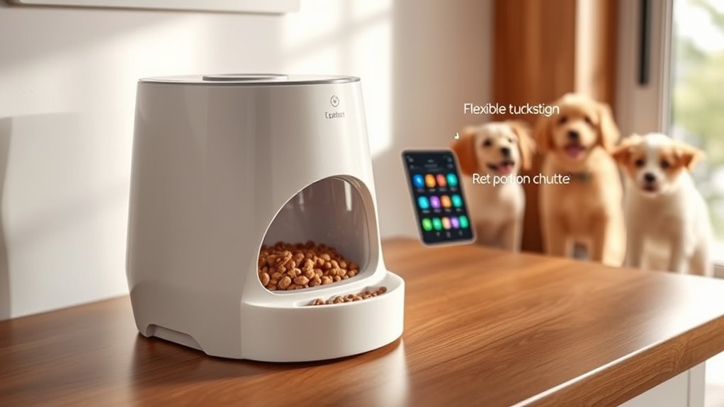 Smart pet feeders typically handle multiple pets eating at once by using individual compartments or adjustable portion controls. I’ve found that feeders with separate meals or timed feeding schedules help prevent conflicts or overeating. Some models even recognize each pet through collars or facial recognition, ensuring each gets their proper share. This way, I can keep my pets happy and fed on time without worrying about food fights or missed meals.