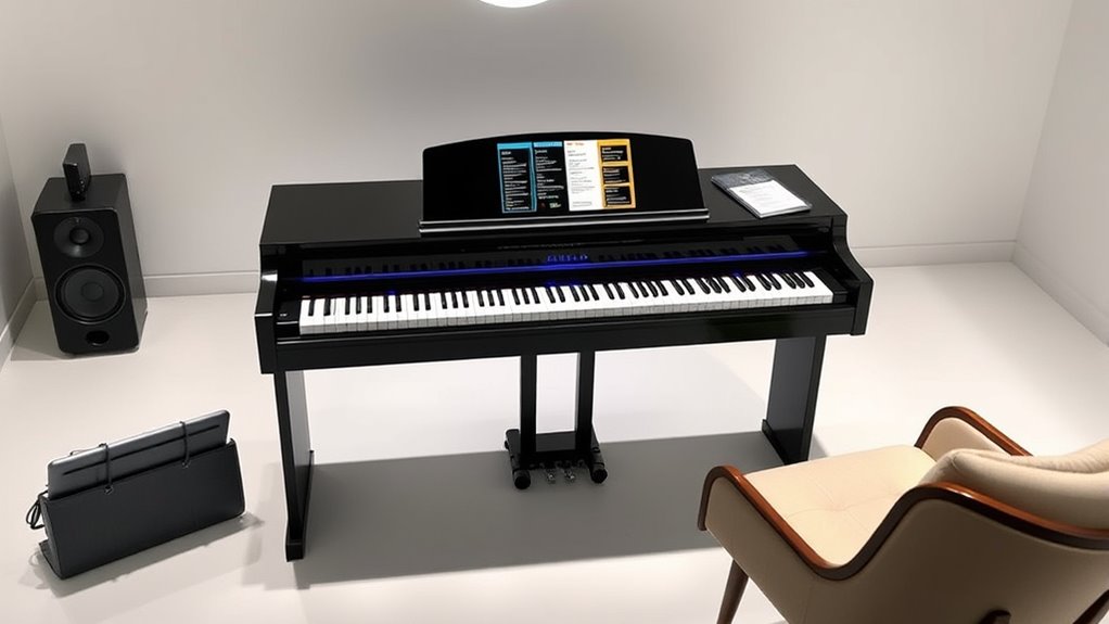 Selecting a smart piano with the right learning features can considerably enhance your practice sessions. Look for models with built-in LED lights or visual guides to help beginners with finger placement and chords, making learning more intuitive. Access to extensive digital sheet music libraries, instructional videos, and interactive games can deepen your understanding and keep practice engaging. App integration is crucial—it allows step-by-step lessons, real-time feedback, and progress tracking, which accelerates improvement. Multiple learning modes, like single-finger chords, ensemble play, and full-scale practice, cater to different skill levels and learning styles. Finally, verify the piano supports connectivity options such as Bluetooth, MIDI, or USB, enabling seamless integration with learning software and devices for a comprehensive, adaptable learning experience.