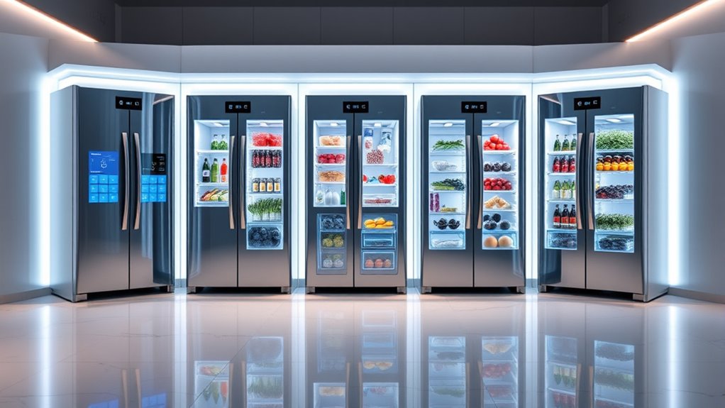 When choosing a smart refrigerator, considering its additional features can substantially boost convenience and functionality. Water dispensers, ice makers, and door alarms make everyday use easier, while advanced odor filtration systems like nanotech filters keep your fridge smelling fresh. Connectivity options such as WiFi and voice control let you monitor and control your fridge remotely, ensuring your food stays at the right temperature. Specialized compartments, like humidity-controlled crisper drawers and convertible zones, improve food preservation and organization. Plus, innovative features like InstaView panels, Craft Ice makers, and customizable lighting add aesthetic appeal and versatility. These extras not only enhance your kitchen experience but also help you tailor your fridge to your lifestyle, making it a smarter, more efficient hub for your home.