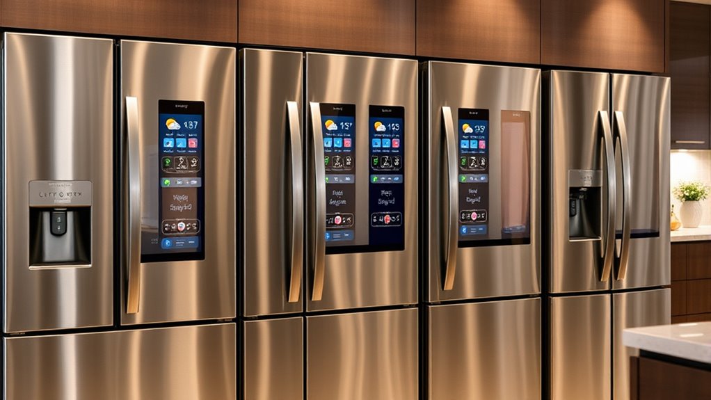 Maximizing storage and organization in a smart refrigerator with a touch screen requires careful attention to its layout and features. I look for plenty of shelves, drawers, and door bins that are flexible and customizable, allowing me to adapt the space for different foods. Adjustable or removable compartments are a plus, so I can tailor storage for produce, beverages, or leftovers. Specialized drawers like crisper zones or multi-temperature compartments help keep perishables fresh longer. Clear visibility is essential, so LED lighting and transparent bins make it easy to find what I need without opening the door unnecessarily. Smart organization features like slide-out trays, dividers, and modular solutions make accessing items simple and reduce clutter, ensuring my fridge remains tidy and efficient.