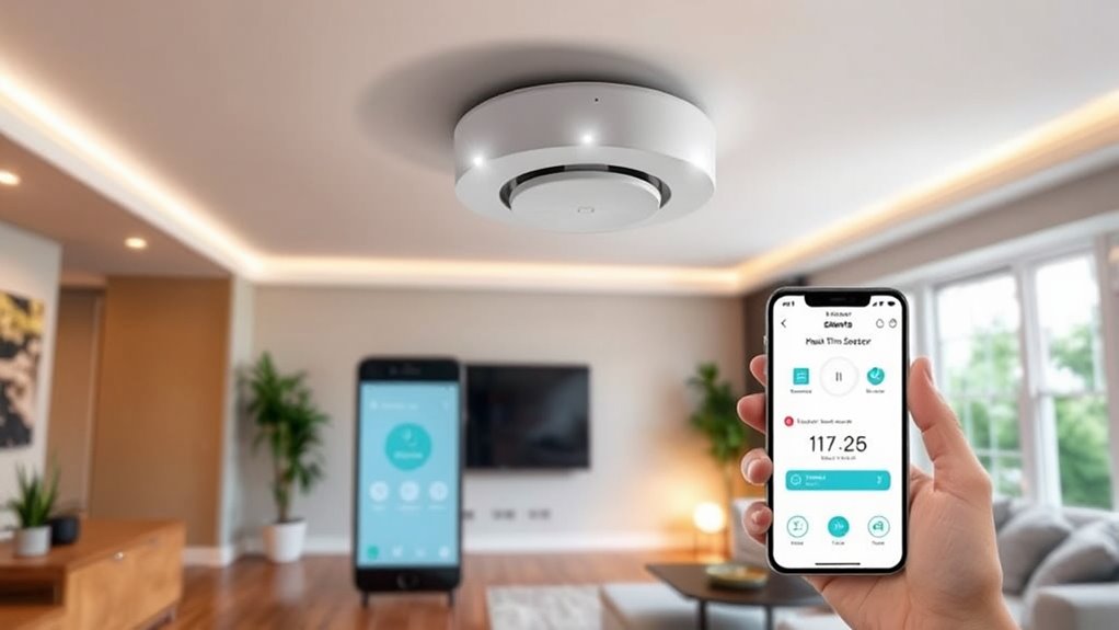 Smart app features are essential for maximizing the safety and convenience of your smoke and CO detectors. A good app provides real-time push notifications for smoke, CO, faults, and low battery alerts, ensuring you’re immediately aware of any issues. It should allow remote testing, silencing alarms, and managing multiple detectors across your home, so you can control everything from anywhere. Device sharing with family members or emergency contacts enhances safety by keeping everyone informed. Clear, location-specific alerts—like voice notifications pinpointing the room with a problem—are vital for quick responses. Additionally, integration with other smart home platforms can streamline automation and improve overall security. Ultimately, a feature-rich app makes your detectors more reliable, easier to manage, and more effective at keeping your home safe.
