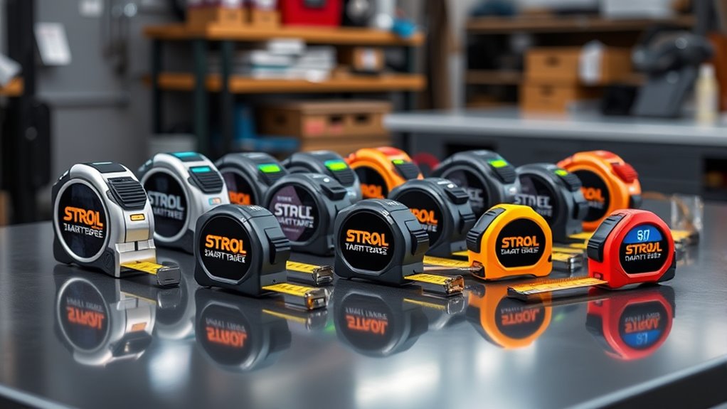Choosing a smart tape measure that can stand up to everyday use requires paying close attention to its durability and build quality. I look for models made from high-impact, shock-resistant materials like ABS plastic or reinforced metal, which can handle drops and rough handling. Reinforced blades with corrosion-resistant coatings, such as nylon or rust-proof paint, ensure the tape remains accurate and rust-free over time. Water and dust resistance ratings, like IP67 or IP54, protect the device in various environments, making it versatile for different work conditions. A sturdy locking mechanism prevents slippage during measurements, maintaining precision. Reinforced hooks and secure locking pins further enhance durability, ensuring the tape measure withstands prolonged use without compromising performance.