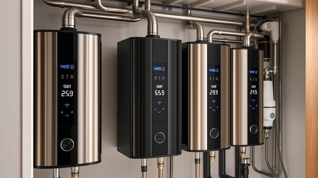 If you’re looking to boost your home’s efficiency, I recommend exploring smart water heaters like electric timers, WiFi-enabled tankless models, and advanced gas units. These devices let you control, monitor, and optimize hot water use remotely, saving energy and increasing safety. From compact point-of-use units to high-capacity systems, there’s a solution for every need. Stick around to discover the top options that can truly transform your home’s water heating experience.