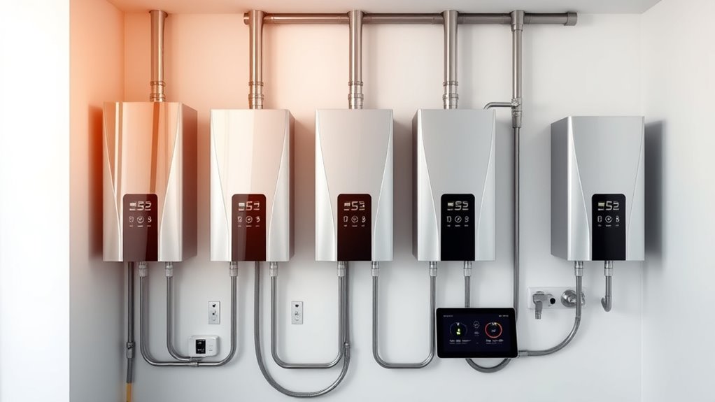 Choosing the right smart water heater means paying close attention to its temperature control features. I look for models that allow precise adjustments, often in 1-degree increments, to optimize comfort and save energy. Digital displays or smartphone apps make it easy to monitor and change water temperature remotely, giving me command from anywhere. Automatic regulation is essential for safety and consistency, preventing scalding and maintaining steady water temperature during use. Advanced control systems can adapt to demand, heating only when needed and reducing waste. Some models offer preset modes or customizable settings, so I can tailor the heater to my household’s specific needs. Overall, effective temperature control ensures safety, comfort, and efficiency in my hot water system.