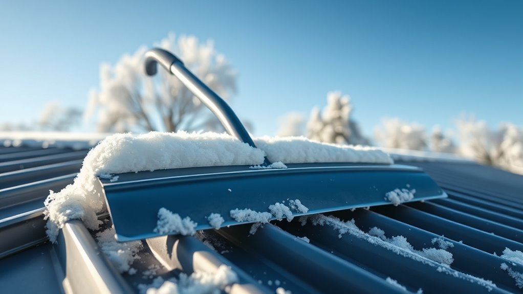 To prevent roof damage when using a snow rake, I always make certain I select the right tool for my roof type, especially a gentle, non-abrasive rake for metal roofs. I work slowly and avoid applying too much pressure, which could bend or damage the metal. Additionally, I clear snow gradually, focusing on thicker layers first, and avoid raking during icy conditions to prevent slips or accidental damage.