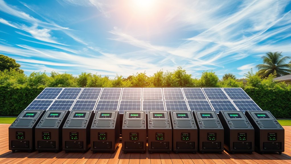 Durability and lifespan are essential factors when selecting a solar generator for home backup, as they determine how long the unit will reliably serve your needs. A durable generator should incorporate high-quality batteries like LiFePO4, which provide more charge cycles—typically between 3,000 and 6,000—before capacity drops markedly. Built with robust materials and equipped with thermal management systems, these units can withstand extreme temperatures and environmental conditions. Proper maintenance, such as avoiding deep discharges and storing the generator in suitable environments, can further extend its lifespan. Additionally, certifications and manufacturer warranties give valuable insight into the product’s durability and overall build quality. Choosing a well-constructed, reliable solar generator ensures you’ll have dependable power when you need it most.