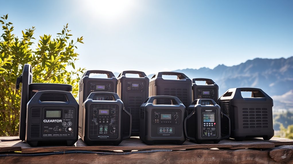 If you’re looking to power your off-grid life in 2025, I recommend exploring the best solar generators like the Jackery Solar Generator 1000 v2, Anker SOLIX C1000, and EF ECOFLOW DELTA 2. These models offer high capacity, fast solar recharging, and portability for various needs—from camping to emergency backup. They feature durable batteries and multiple outlets, ensuring versatile device compatibility. Keep exploring as I’ll share more details on each to help you find the perfect fit.