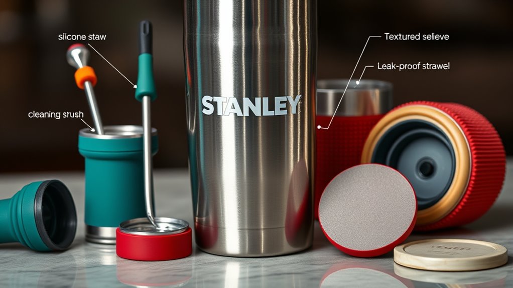 To clean and maintain your Stanley tumbler accessories, I recommend hand washing them with warm, soapy water regularly. Use a soft brush or sponge to scrub any stubborn stains or residue, especially in the lid or straw. Avoid abrasive cleaners or dishwasher use to prevent damage. Rinse thoroughly and let them air dry completely before reassembling. This routine keeps your accessories hygienic and in top condition, ensuring a great drink experience every time.