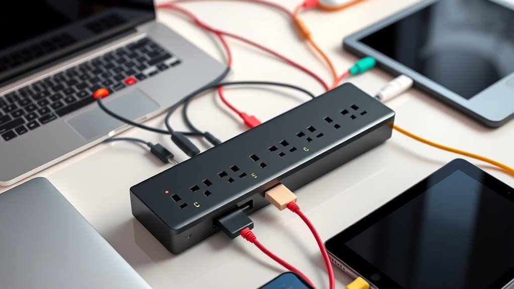 Choosing a surge protector with USB charging options can greatly simplify powering multiple devices. Look for USB ports with at least 5V/3A or higher to guarantee fast charging for several devices at once. Smart charging technology is a plus, as it detects connected devices and adjusts power delivery for maximum efficiency, preventing overcharging. Check the total wattage or amperage capacity of the USB ports to avoid overloads and ensure safe charging. If you use USB-C devices, opt for a surge protector with a dedicated USB-C port supporting Power Delivery (PD), which offers faster, more versatile charging. Finally, confirm that the USB ports meet safety standards and are certified to protect your devices during power fluctuations or surges, ensuring both safety and reliability.