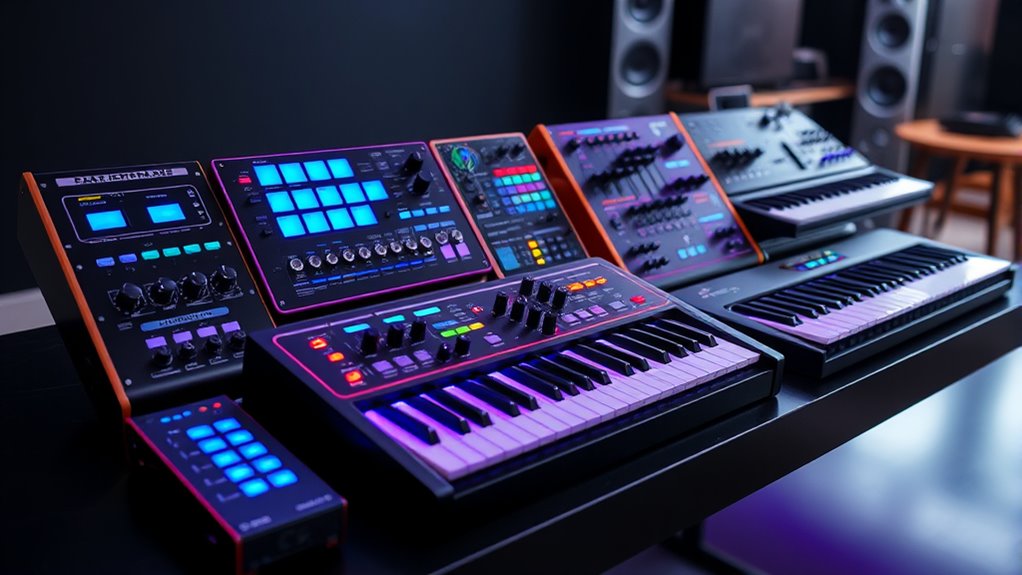 In 2025, synthesizer technology is all about hybrid designs and advanced AI integration. I see more synths blending digital and analog elements, giving us richer, more versatile sounds. AI-driven features are helping me explore new sonic territories effortlessly, while improved connectivity guarantees seamless integration with my existing gear. These trends make sound creation more intuitive and expansive, pushing the boundaries of what I can achieve in my productions.