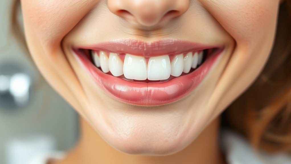 Choosing teeth whitening strips that prioritize enamel safety is essential, especially if you have sensitive teeth. Look for products formulated to prevent enamel erosion and damage during use. Strips with a pH level close to neutral (around 7) are gentler and less likely to cause demineralization. Ingredients like hydroxyapatite or coconut oil can support enamel strength while whitening. Regulatory standards, such as those set by the FDA or ADA, often require rigorous enamel safety testing, ensuring the product’s safety. Additionally, selecting strips with lower peroxide concentrations and natural, gentle active ingredients reduces the risk of harm. By focusing on these standards, you can enjoy a brighter smile without compromising your enamel’s health or sensitivity.