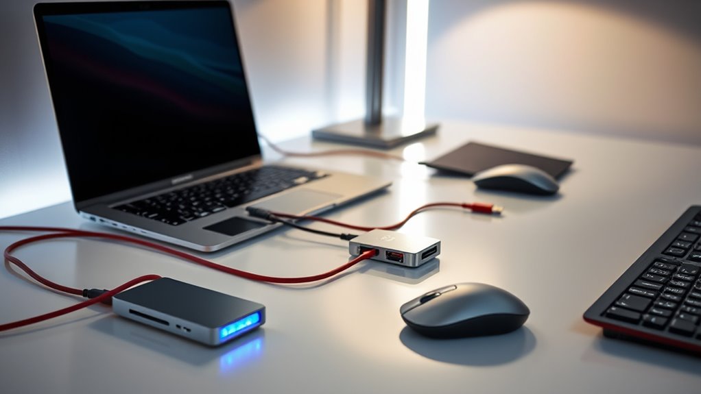 When selecting a Thunderbolt 4 hub or certified cable, considering the variety of ports available is crucial for guaranteeing seamless connectivity. A good hub should include diverse ports like HDMI, USB-A, Ethernet, and SD card readers, enhancing compatibility with various peripherals. Multiple Thunderbolt 4 and USB-C ports allow me to connect several high-speed devices simultaneously, boosting productivity. Video output options, such as dual 4K or a single 8K, guarantee I can work with different high-resolution displays without issues. Power delivery ports with different wattages, like 96W or 100W, let me charge multiple devices efficiently without sacrificing performance. Additionally, legacy ports like USB-A and SD card readers keep older peripherals compatible, making the hub versatile for all my connectivity needs.