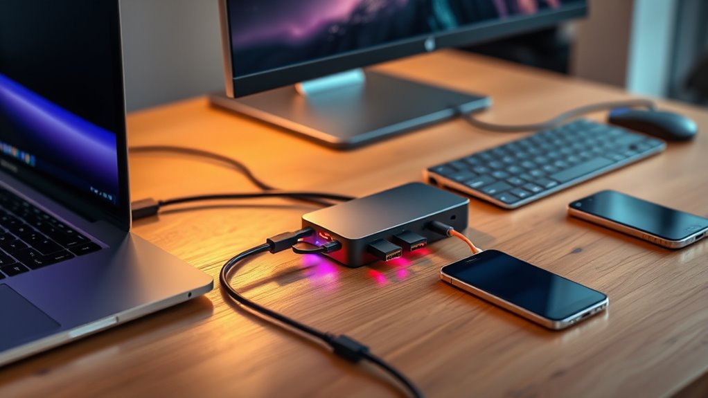 When selecting a Thunderbolt dock, build quality and design play a crucial role in ensuring durability and ease of use. I look for docks made from durable materials like aluminum or high-quality plastics, which boost longevity and robustness. A well-designed chassis with proper ventilation prevents overheating during long sessions. Compact and lightweight designs make it easier to carry and integrate into any workspace. Secure port connections and reinforced cables are essential for withstanding frequent plugging and unplugging without wear. Aesthetically, seamless finishes, ambient lighting, and a minimalistic profile help create a professional look that complements my setup. Ultimately, a thoughtfully designed dock not only looks good but also offers reliable performance and longevity, making it a smart investment for my productivity.