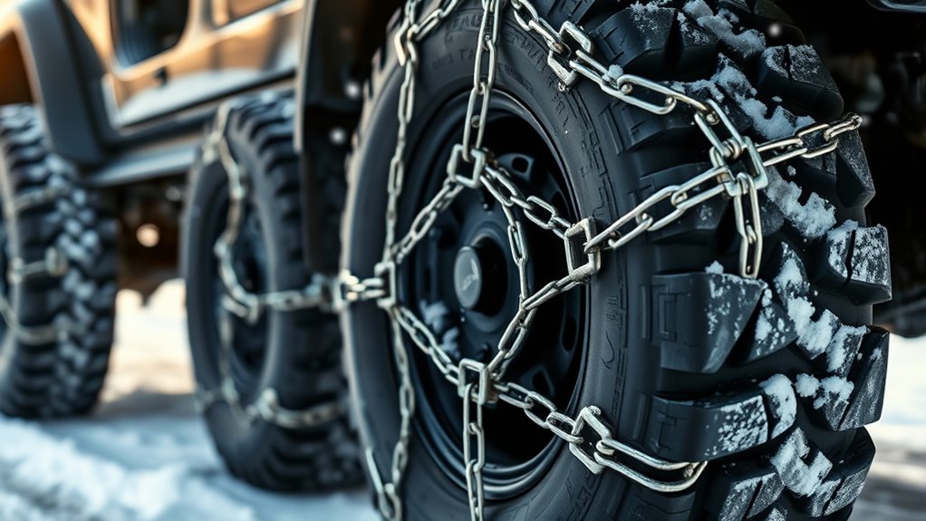 Traction performance hinges on the design and materials of the tire chains, making it essential to pay close attention to these factors. A diamond pattern provides smoother rides and better grip, especially on icy surfaces. The quality of steel impacts slip prevention and stability, so opt for high-grade materials. Proper tension and fit are critical; chains must stay snug against the tire without damaging the rubber or slipping. Reinforced cross links and anti-slip features boost grip in extreme winter conditions like ice and deep snow. Additionally, compatibility with your specific tire size and vehicle type is crucial for ideal traction and safety. Choosing chains tailored to your SUV or truck ensures you maintain control and confidence, no matter how challenging the weather gets.