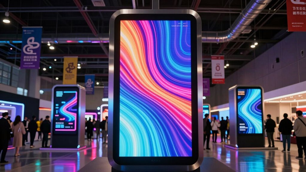 Choosing the right screen size and resolution is vital for making your event displays stand out. Larger screens, like 65 inches or more, are perfect for big venues, guaranteeing everyone can see the content clearly from a distance. High-resolution displays, such as 4K or 2K FHD, deliver crisp, detailed visuals that keep viewers engaged. For indoor events, IPS panels with wide 178° viewing angles ensure consistent image quality regardless of where people are standing. If your event is outdoors or in bright environments, high-brightness screens (1000 nits or more) greatly enhance visibility. Ultimately, selecting the appropriate size and resolution depends on your space and viewing distance, helping you maximize impact and clarity for your audience.