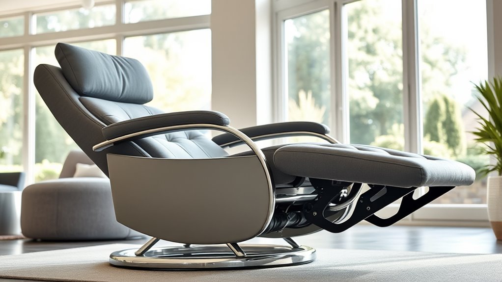 To find the perfect zero-gravity recliner, it’s important to focus on models with multiple adjustable features that let you customize your comfort. Look for recliners with adjustable backrests and footrests, so you can easily switch between zero-gravity and upright positions. Power or manual controls should allow precise adjustments, ensuring you find the perfect angle for relaxation. An adjustable headrest and lumbar support are essential for targeting specific areas and enhancing comfort. User-friendly control panels, remote controls, or touchscreen interfaces make adjustments effortless. Additionally, consider models with adjustable massage and heating functions, so you can tailor relaxation to your needs. These features help create a personalized experience, making your recliner not just comfortable but perfectly suited to your preferences.