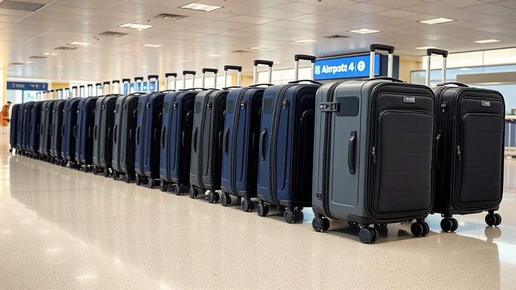 Security features are crucial when selecting a travel garment bag with wheels because they help protect your clothing and valuables from theft or tampering. I look for bags with lockable zippers or TSA-approved locks, ensuring I can secure my belongings during transit. Secure hanger brackets or compartments are essential to prevent clothing from shifting and becoming accessible to others. I prefer bags with discreet designs that don’t reveal their contents, reducing the risk of theft. Reinforced or tamper-proof materials add extra protection against unauthorized access or damage. Additionally, I check for anti-theft lock systems or hidden pockets specifically designed for valuables, offering peace of mind. Prioritizing these security options helps me travel confidently, knowing my belongings are well-protected throughout my journey.