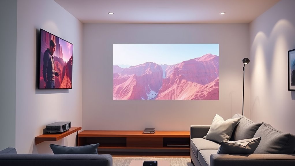 Room lighting conditions can profoundly impact how well your ultra short throw projector performs. Bright rooms with ambient light can wash out images unless you choose models with ambient light rejection screens, which help produce vibrant, high-contrast visuals even in well-lit spaces. The projector’s lumen output should match your room’s lighting; higher lumens (2400-3000) are essential if you have significant ambient light. For rooms with variable lighting, opt for projectors with advanced contrast ratios and dynamic laser dimming to maintain clarity. Additionally, coordinating lighting fixtures and window treatments minimizes glare and reflections that can diminish picture quality. Properly addressing your room’s lighting environment guarantees you get the best possible image, regardless of the lighting conditions, making your home entertainment truly stunning.