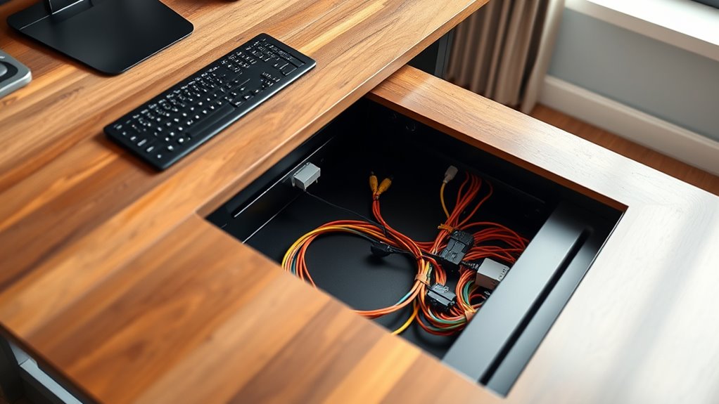 Think of cable trays as the steady keel of a ship; they keep everything balanced. They don’t directly affect desk height adjustments, but if installed improperly or too bulky, they can interfere with your movement. I’ve found that choosing slim, adjustable trays helps maintain flexibility, allowing you to raise or lower your desk comfortably. Proper placement guarantees your workspace stays ergonomic without sacrificing style or functionality.