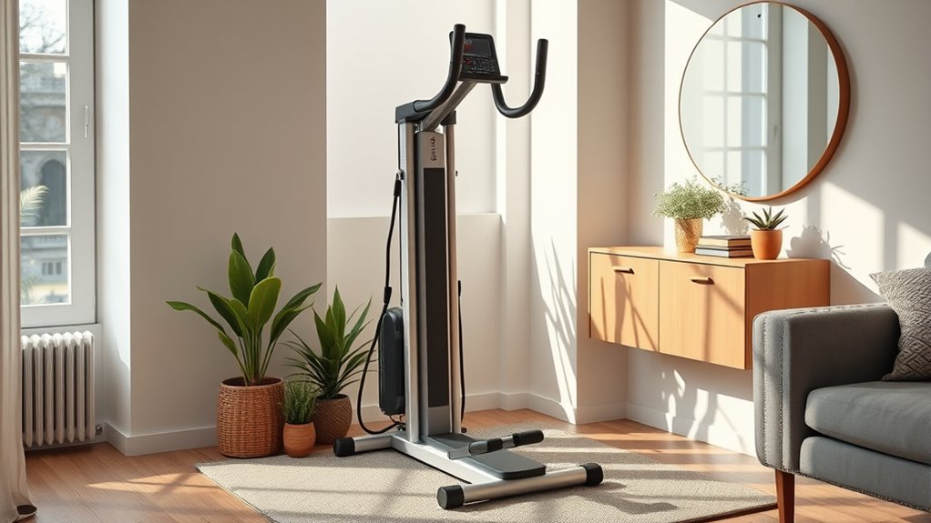 Have you ever worried about your vertical climber wobbling during intense workouts? Stability and safety features are vital, especially in small spaces. Look for machines with a sturdy, reinforced steel frame, preferably triangular, to guarantee stability during vigorous use. Wide base feet with anti-slip pads or leveling mechanisms help prevent wobbling on uneven floors, keeping you secure. Safety features like secure handrails and non-slip pedals reduce the risk of slips and falls. Also, check that the maximum user weight capacity exceeds your body weight for added safety. A low-impact, smooth motion is essential to minimize joint stress and prevent sudden jolts that could cause injury. Prioritizing these features will make your workouts safer and more effective in tight spaces.