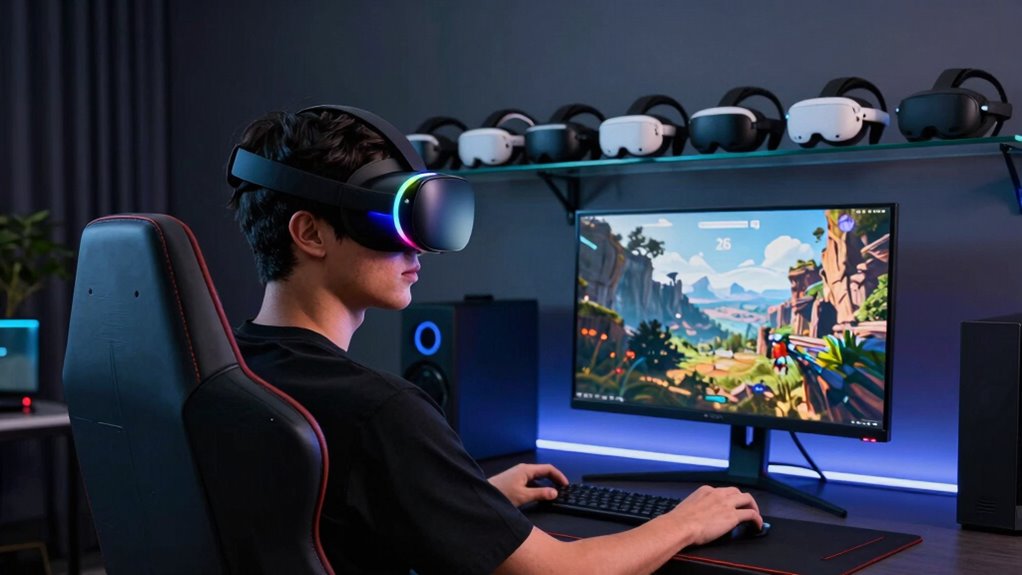 VR headsets guarantee comfort during long seated gaming sessions by featuring adjustable straps and lightweight designs that reduce strain. I find that padded face cushions and ergonomic shapes help prevent discomfort around my face and neck. Additionally, many headsets offer customizable fit options and balanced weight distribution, making extended play sessions more enjoyable without fatigue. These thoughtful features keep me immersed and comfortable, even during hours of gameplay.