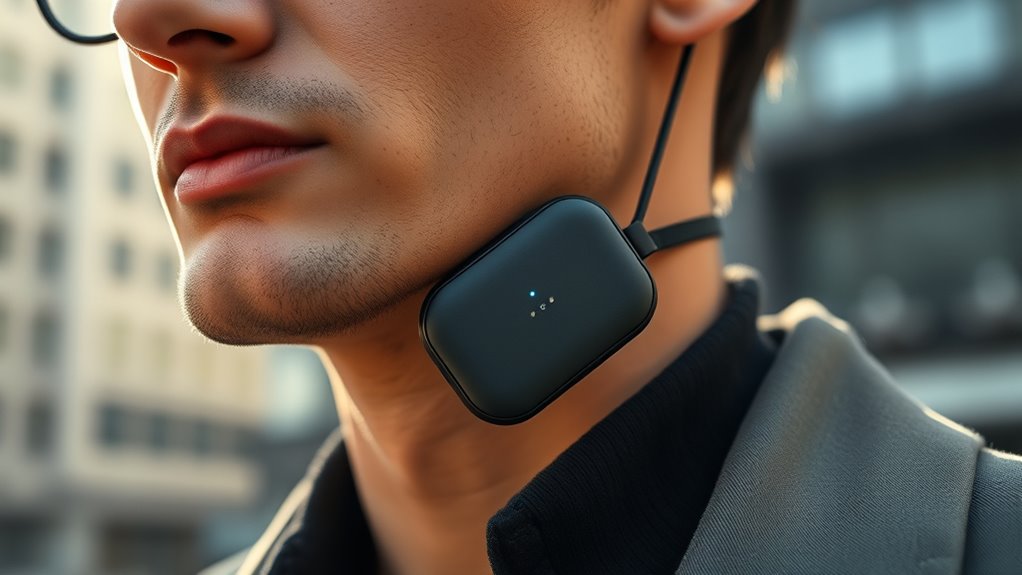 Selecting a wearable air purifier that feels comfortable throughout the day hinges on its design and fit. It should be lightweight and compact so you can wear it for hours without fatigue. Look for adjustable straps, ergonomic shapes, or customizable fittings to guarantee a snug, pressure-free fit. Good design features, like breathable airflow and positive pressure, boost comfort while maintaining filtration efficiency. Materials matter—choose skin-friendly, hypoallergenic options to prevent irritation, especially if you wear it for long periods. Noise levels are also important; a quieter device won’t distract you or require constant readjustment. Stability during movement is key, so ensure it stays secure whether you’re walking, working, or commuting. Comfort and portability should go hand-in-hand for all-day wear.