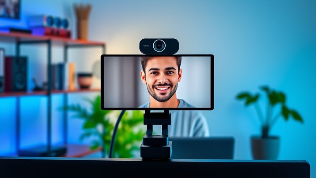 Clear visuals are just as important as sharp autofocus, especially in low-light settings where uneven or insufficient lighting can ruin a good shot. A webcam with automatic light correction adjusts brightness and contrast in real-time, making images clearer without manual tweaks. Larger pixel sensors perform better in dim conditions, capturing more light for sharper video. Features like HDR enhance details in shadows and highlights, even when lighting is poor. Quick autofocus and exposure adjustments help the camera adapt to changing light during streams or recordings. Additionally, external lighting accessories, like ring lights, can dramatically boost low-light performance, ensuring your face is well-lit and vibrant. When choosing a webcam, prioritize those with these features to guarantee your video quality remains excellent, no matter the lighting conditions.