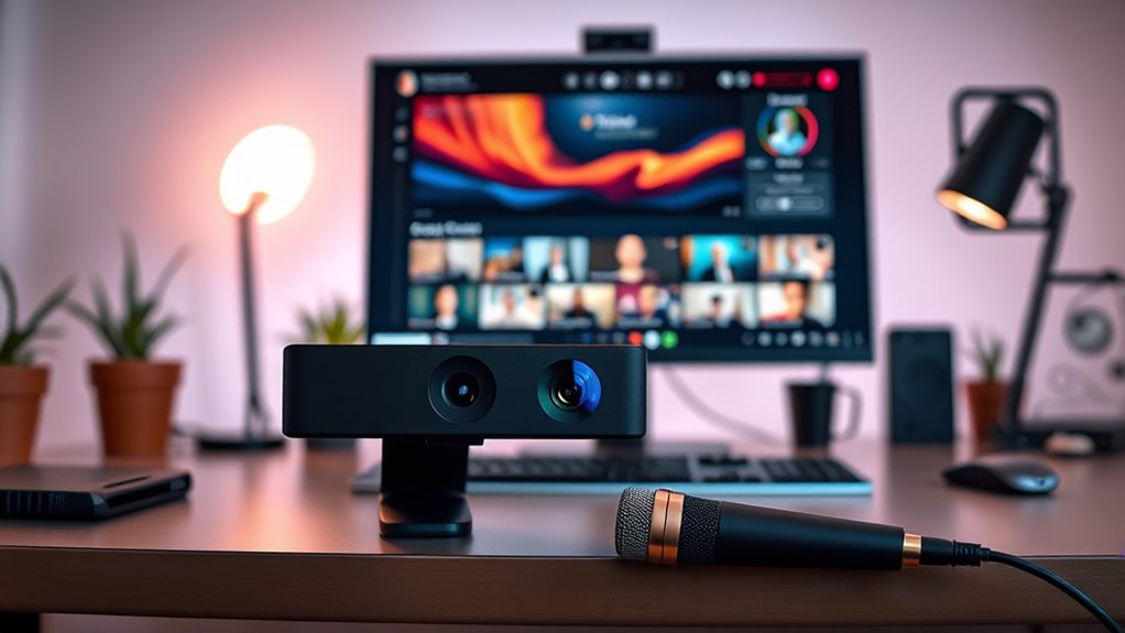 Clear audio is just as important as sharp video when creating engaging content. High-quality webcams often feature dual microphones with noise-canceling tech, which helps deliver natural, crisp sound. Placing microphones on either side of the lens captures stereo sound, enriching the listening experience. Some models incorporate AI noise reduction algorithms that filter out background noise, giving your audio a professional feel. Microphone sensitivity and pickup range are also essential—many webcams effectively pick up sound from several feet away, allowing for more natural movement. Additionally, integrated microphones should be compatible with various platforms and software, ensuring seamless recording and communication. Prioritizing these audio clarity features guarantees your viewers hear you loud and clear, elevating your content quality.