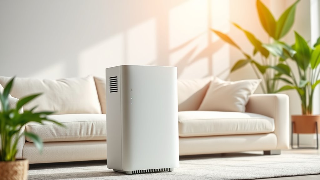 Matching your air purifier’s coverage area to the size of your space is key to effectively reducing allergens. I always check the CADR ratings to verify the purifier can handle the square footage of my home or specific rooms. For open-concept layouts or multiple rooms, I prefer units designed for large spaces to prevent allergen buildup. It’s important to select a purifier that matches your home’s total square footage if you’re aiming for whole-house air cleaning. Additionally, I look for models with adjustable fan speeds and modes, which help optimize air cleaning depending on room size and occupancy. Proper size matching ensures the device operates efficiently, providing cleaner air without wasting energy or underperforming. This step is essential to maximize allergen removal and improve indoor air quality.