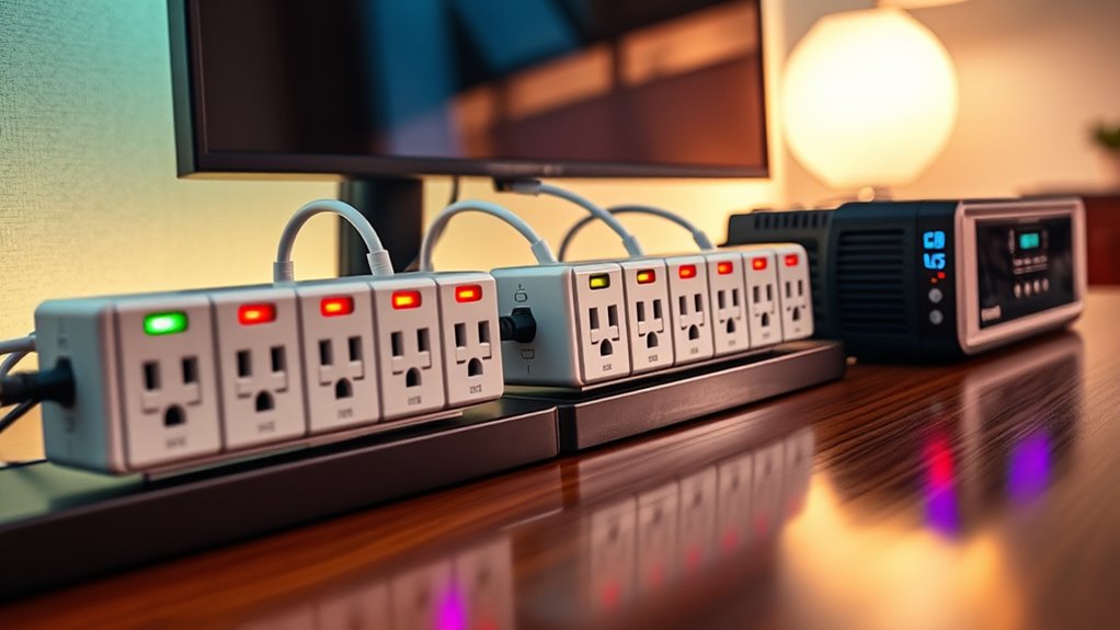 Surge protectors generally don’t impact your energy efficiency much, but some models can add a slight standby power draw. I’ve noticed that high-quality protectors with built-in energy-saving features help reduce unnecessary power consumption. To maximize efficiency, I choose surge protectors with low energy drain and make sure to turn off devices when not in use. Overall, a good surge protector safeguards my gadgets without considerably affecting my energy bills.