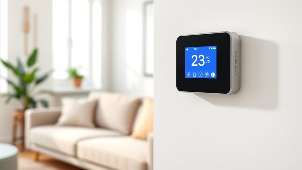 When it comes to maximizing comfort and saving energy, programmable features can make a big difference. They let you set customized heating schedules that match your daily routines, so you’re not wasting energy when you’re not home or asleep. Many models support multiple daily periods, giving you precise control over temperature changes during different times of the day and week. Some thermostats even include holiday or vacation modes, automatically adjusting settings when you’re away to conserve energy. Advanced options can learn your preferences over time, fine-tuning schedules for ideal comfort and efficiency. Plus, remote programming via smartphone apps adds convenience, allowing you to change settings instantly from anywhere. These features help you stay comfortable while reducing energy costs effortlessly.