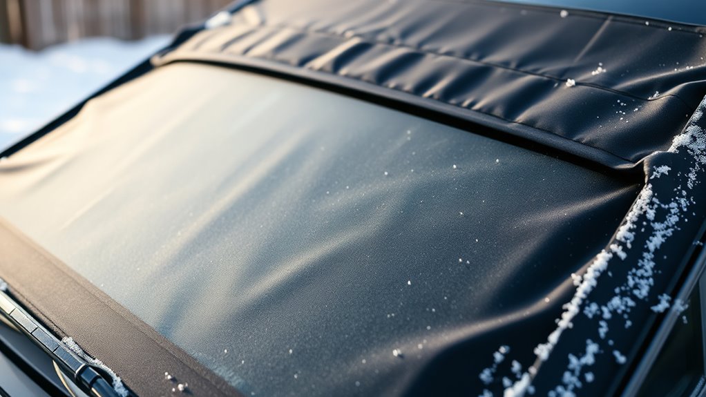 When selecting a windshield frost guard, paying attention to wind resistance features is essential because strong winds can quickly displace or damage an inadequately secured cover. A strong magnet seal is fundamental, as it helps prevent the cover from blowing away in stormy conditions. Reinforced elastic edges and side flaps also secure the cover tightly, reducing the risk of displacement during gusts. Multiple magnets embedded along the edges create an airtight seal, boosting stability against wind pressure. Using durable, windproof materials like four-layer composite fabrics allows the cover to withstand wind speeds up to 60 mph without tearing or shifting. Additionally, a proper fit and secure attachment points are critical to guarantee the cover stays firmly in place, no matter how blustery it gets outside.