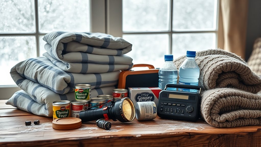 To guarantee you’re prepared for any winter storm scenario, it’s essential to choose supplies that serve multiple purposes and adapt to different environments. I focus on items that work across situations like power outages, road closures, or sheltering in place. Multi-purpose tools, such as thermal blankets and waterproof clothing, ensure I stay warm and dry regardless of conditions. I include both consumables—water, non-perishable food, electrolytes—and durable items like flashlights and first aid kits, so I’m ready for various emergencies. Organizing supplies for quick access is key, whether I’m at home, in a vehicle, or at a shelter. I also consider seasonal factors and keep my kit flexible, so I can expand or modify it for scenarios like wildfire smoke or prolonged outages.