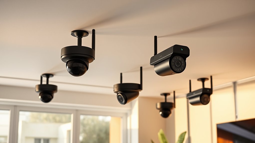 When evaluating wireless CCTV cameras, connectivity compatibility is key to guaranteeing smooth operation and reliable footage access. I always check if the camera supports my existing Wi-Fi frequency, whether 2.4GHz or 5GHz, for ideal performance. Compatibility with my smart home ecosystem, like Alexa or Google Assistant, makes device integration seamless. It’s also important to verify that the cameras use standard Wi-Fi protocols, such as IEEE 802.11n, ac, or ax, to maintain a stable connection. Security features like WPA3 are vital to protect my data from threats. Lastly, I consider how easy the setup is and whether I might need additional hardware, like Wi-Fi extenders or mesh systems, to guarantee full coverage. These factors help me choose a reliable, secure system.