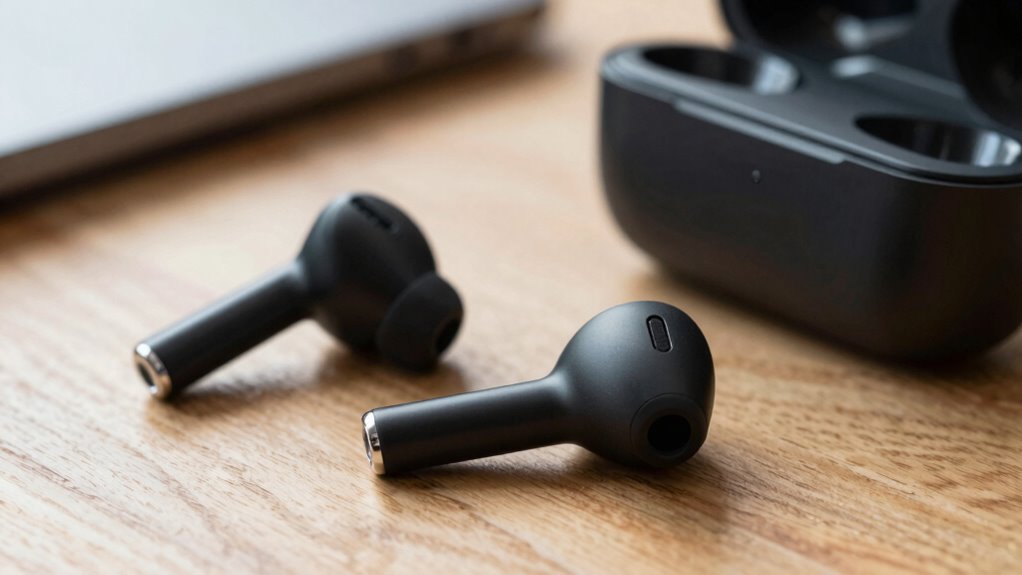 Ensuring a stable connection is essential for a satisfying wireless earbud experience, especially under $200 where you want reliable performance without breaking the bank. Look for earbuds equipped with Bluetooth 5.3 or higher, as they offer reduced latency and stronger pairing stability. A wider range, ideally 15 meters or more, lets you move freely without audio dropouts. Features like automatic pairing and multi-device switching help keep your connection seamless across different gadgets. Advanced Bluetooth protocols and anti-interference tech improve signal stability, even in busy environments crowded with wireless signals. Environmental noise reduction in the connection itself can also prevent disruptions caused by physical barriers or interference. Prioritizing these factors guarantees you enjoy consistent, high-quality audio wherever you go.