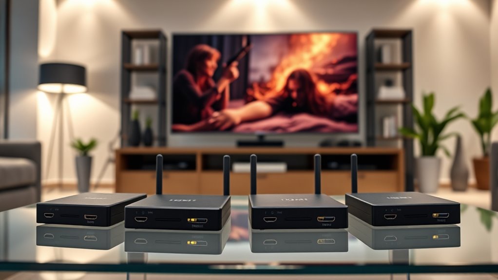 Choosing a wireless HDMI extender that offers reliable power and signal stability is vital for uninterrupted streaming. I look for models supporting dual-band technology (2.4G and 5G) to reduce interference and keep signals steady. It’s important to check the maximum transmission range, especially in environments with walls or furniture, which can weaken signals. Extenders with external antennas or signal boosters often provide better coverage over longer distances. Latency matters too—I aim for ultra-low latency (around 0.06 to 0.1 seconds) to ensure real-time response without lag. Compatibility with my source and display devices is essential, particularly if features like IR remote control or HDMI loop-out are supported. Prioritizing these factors helps guarantee a smooth, reliable streaming experience.